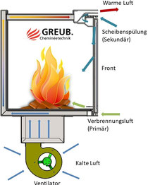 Die Sekundärluft lässt sich ebenfalls durch einen Schieber regulieren. Diese Luft strömt über die Keramikglasscheibe und vermindert so das Beschlagen.